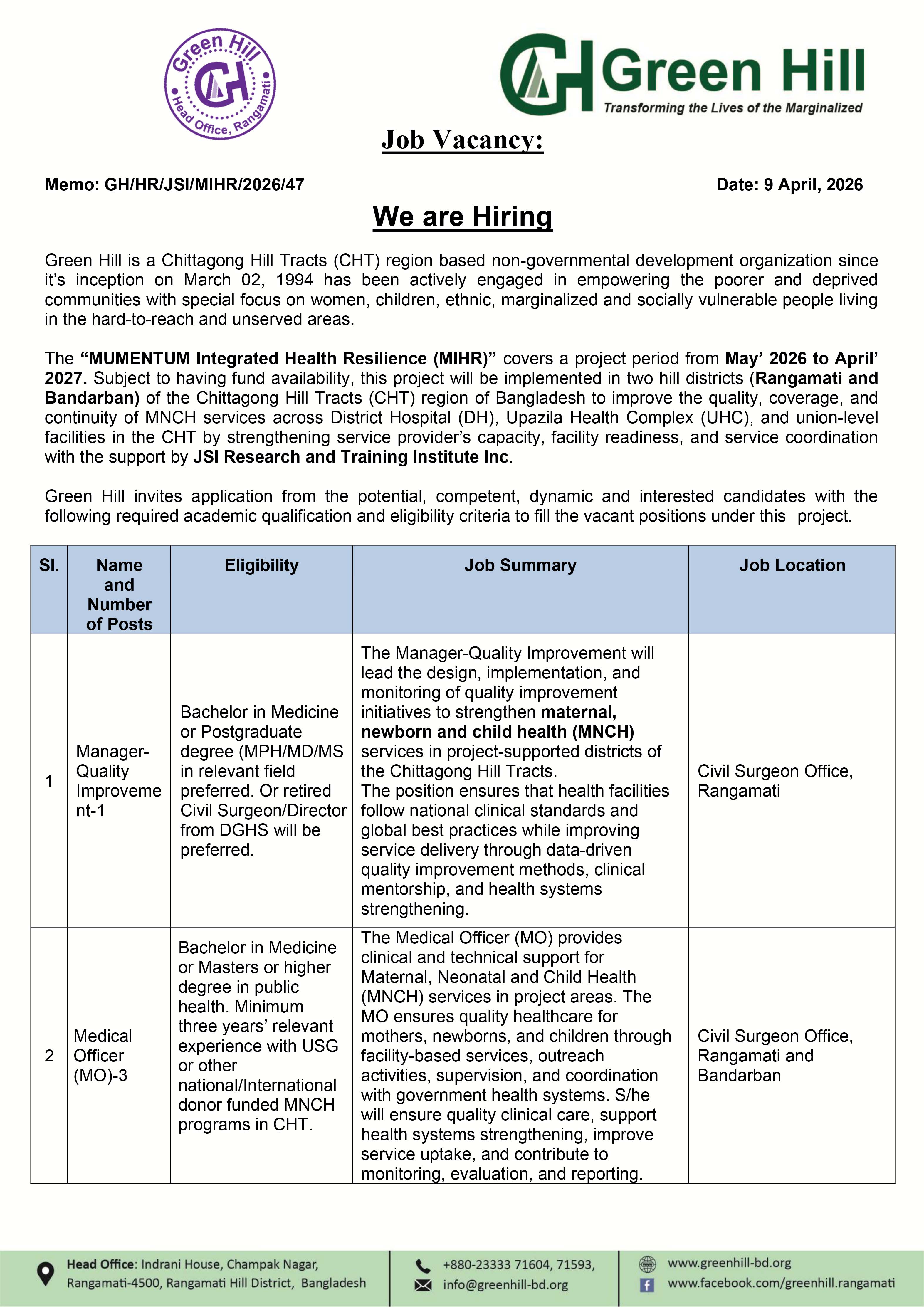"MUMENTUM Integrated Health Resilience (MIHR)" Project Vacancy Announcement